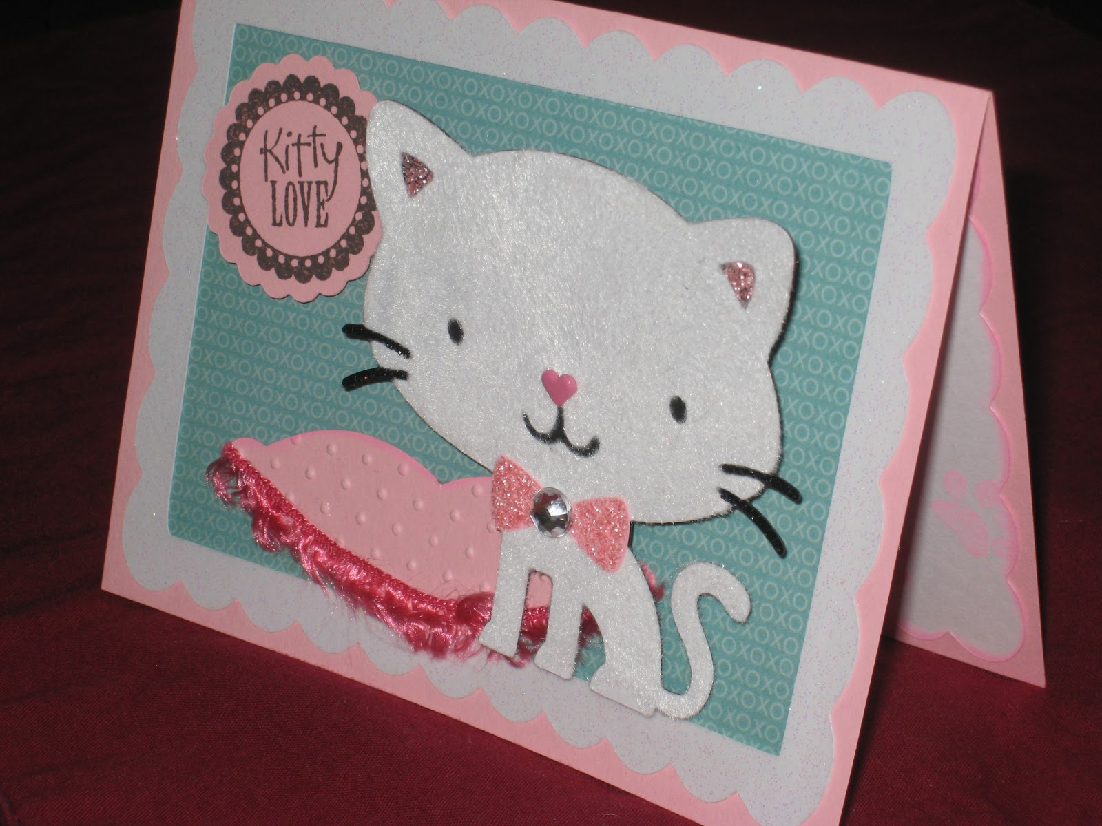 The inside, I cut the mat on white cardstock by going into the DS frame about and just hiding the inside cut of the frame. I inked the edges in pink and then stamped the sentiment and the little paw prints in the same pink. Have a great day everyone!